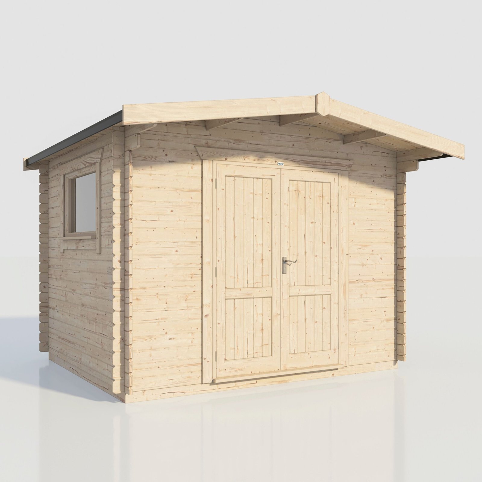 The 28mm Power Chalet Log Cabin Workshop has the pointed gable end as the front of the building, meaning the roof slopes down to the left & right. Solid timber double doors & a double glazed side window come included as standard.