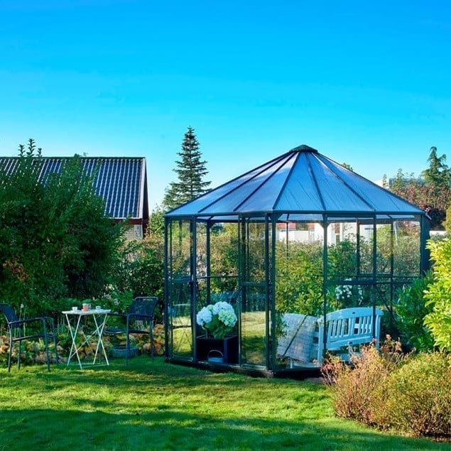 The Halls Atrium is a high roofed octagonal greenhouse with plenty of space for all your plants and for relaxing in. Featuring long-pane toughened safety glass in the walls makes for an elegant greenhouse without unsightly joints in the glass or overlapping clips like found on cheaper greenhouses.