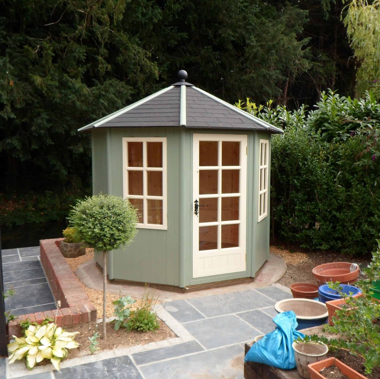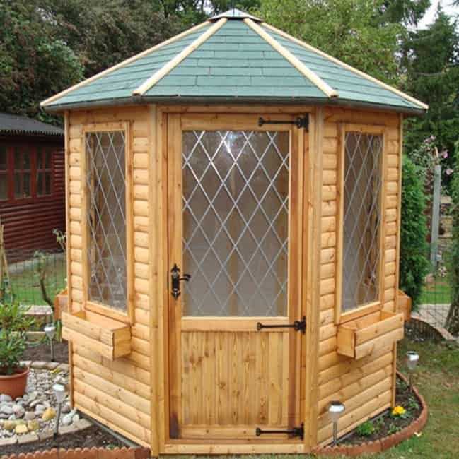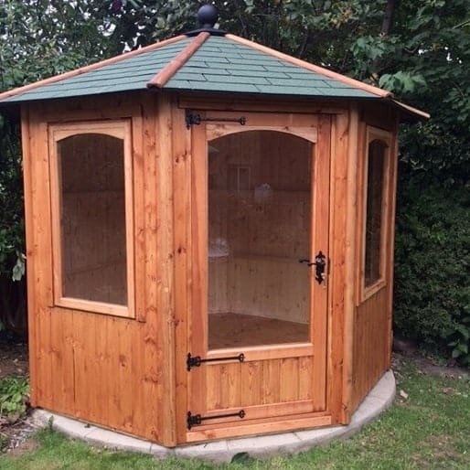 The Brampton is one of A&J’s three octagonal summerhouses, this one being the only one with a single door and also 15mm thick logroll curved wall cladding.