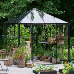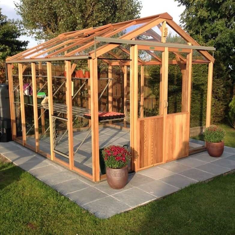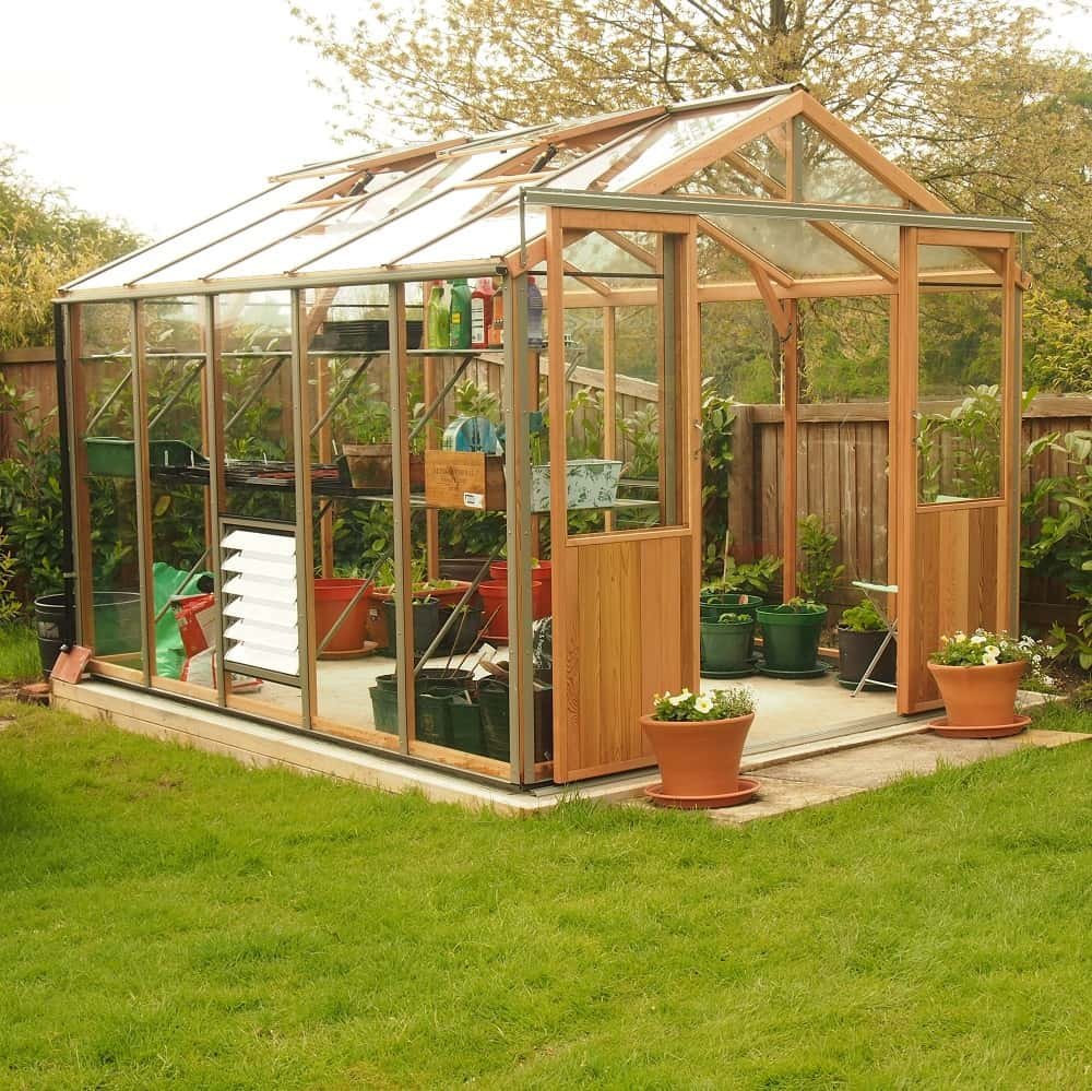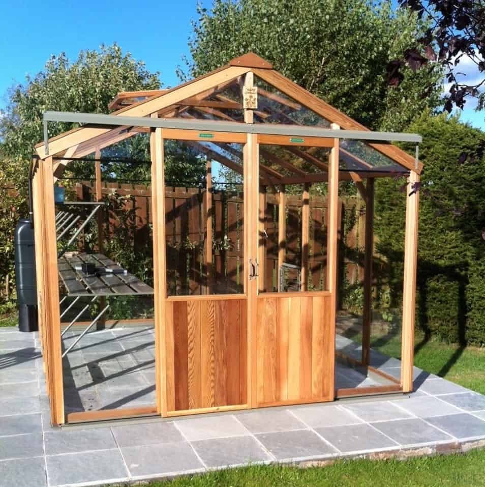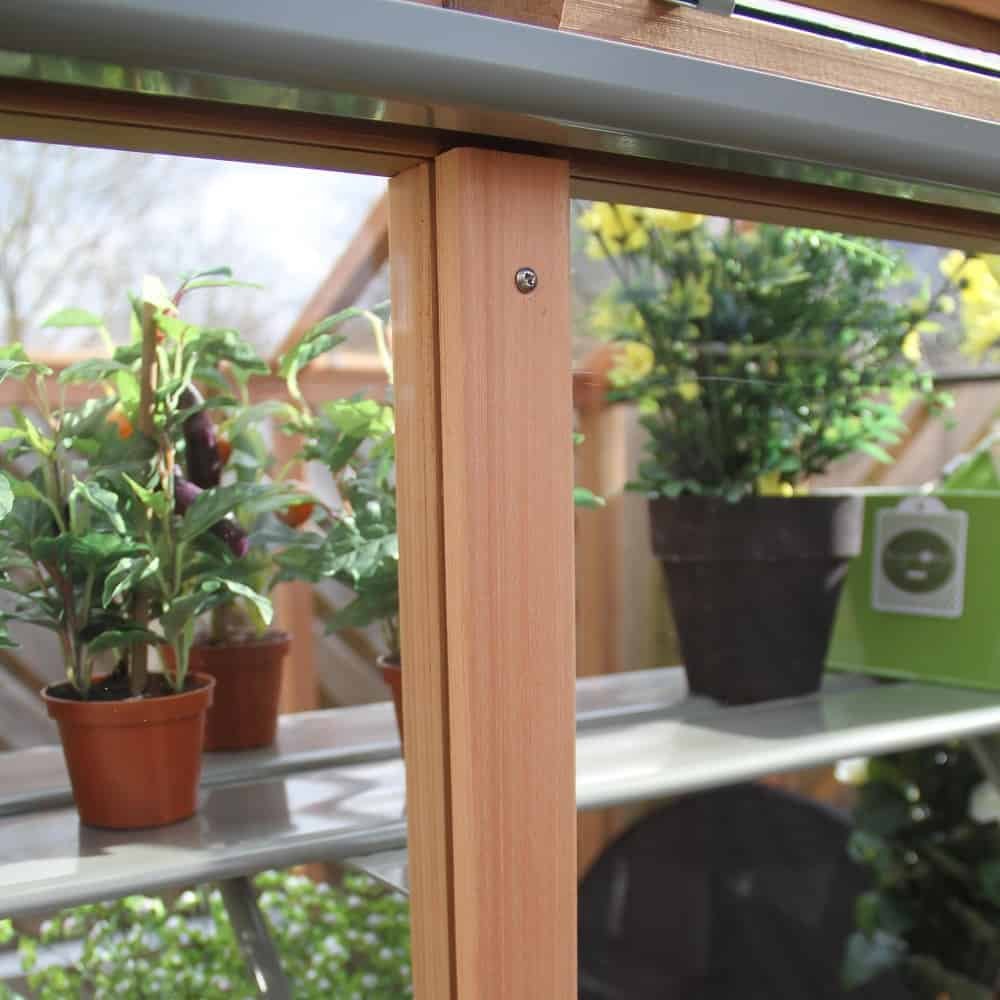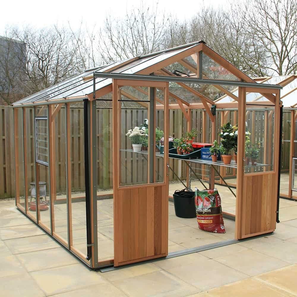 This 8’7″ wide Alton Evolution cedar greenhouse has the advantage over its smaller cousins of having an extra wide (4ft) double door.