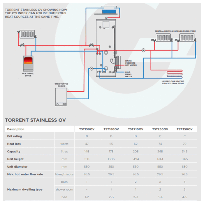 The Gledhill Torrent Stainless OV replaces the Gledhill Torrent Eco OV cylinder and offers unparalleled options for your home’s heating and hot water requirements. Its design focuses on reducing heating costs while allowing the use of multiple energy sources, making it an ideal choice for homeowners.
