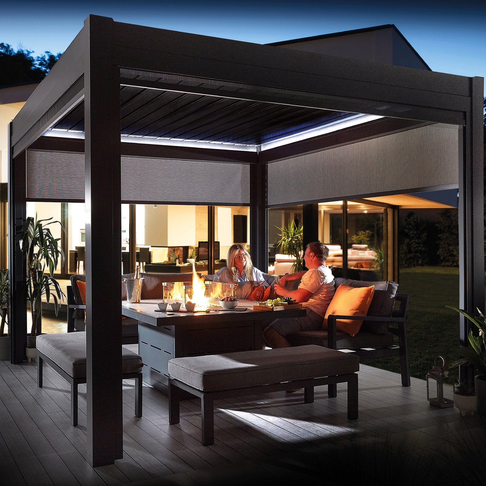 The Hex Marchington Pergola features an innovative roof system with open/close louvres providing protection from the rain, sun and wind.