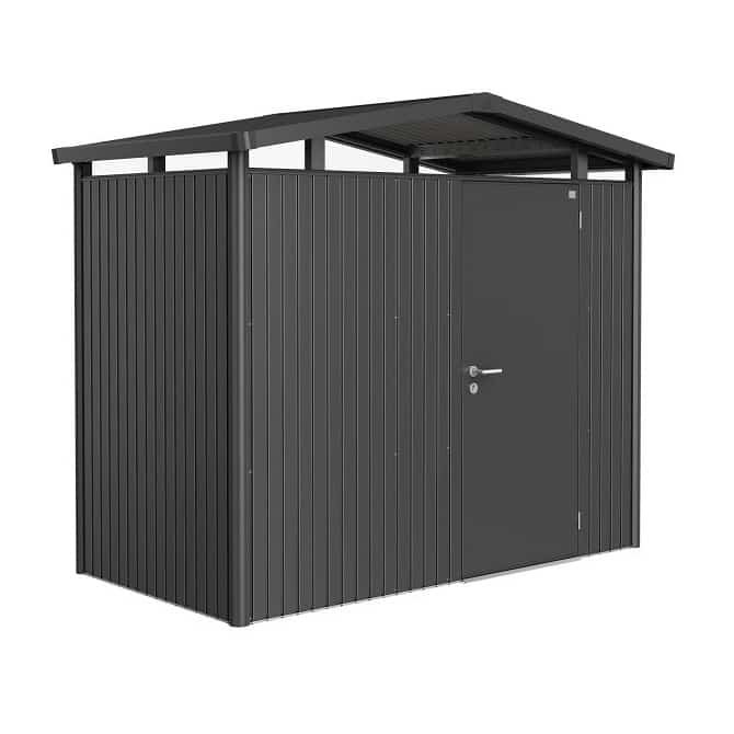 The Biohort Panorama metal shed is a solid & secure apex metal shed with high level fanlight windows around the whole roof line for added light & attractiveness.