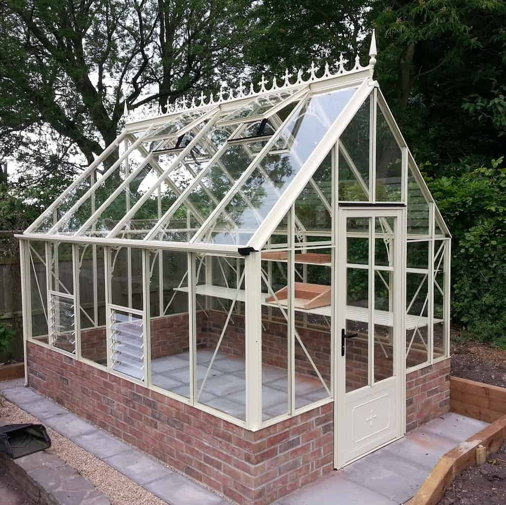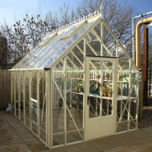At 8’7″ wide, this Rushmoor dwarf wall version of the Victorian greenhouse, sat on brickwork, can be extended to any length you wish.