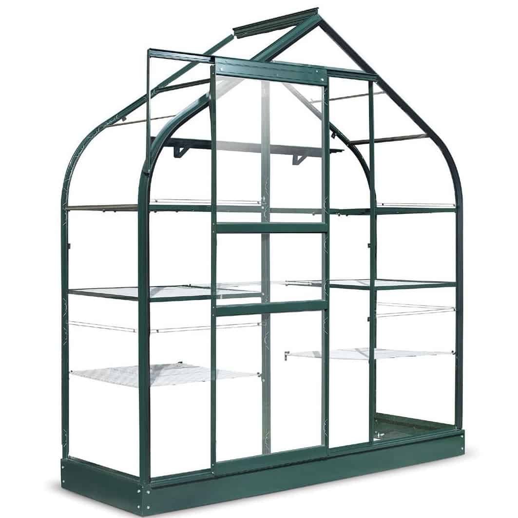 Available only in a 6′ x 2′ size and green colour, this compact greenhouse with curved eaves fits against a brick wall. Includes staging, shelving & seed trays.