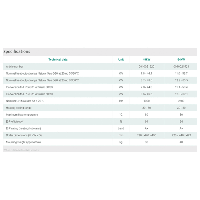 Vaillant is dedicated to innovative and sustainable design. The EcoTEC plus 64kW model is ErP A rated and can achieve ErP A+ when paired with Vaillant VRC 700 and 700F controls. Featuring a stainless steel heat engine, it offers an impressive operating combustion efficiency of 94%, reducing waste and lowering NOx and CO2 emissions.
