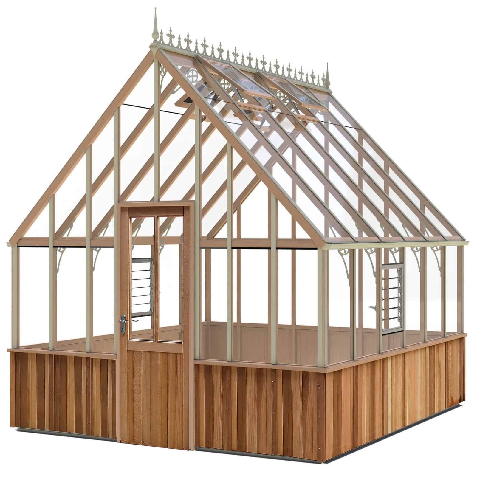 The largest greenhouse in the cedar Victorian range at 10’9″ wide, this model has a cedar half boarded bottom which enhances the beautiful design.